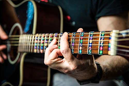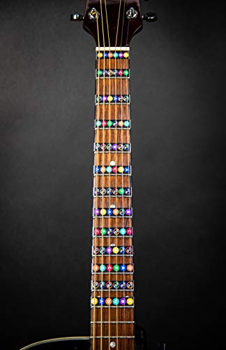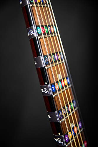 Optimaal leren voor beginners: door het kleurconcept van de gitaarstickers leer je beter op de greepplank te vinden.